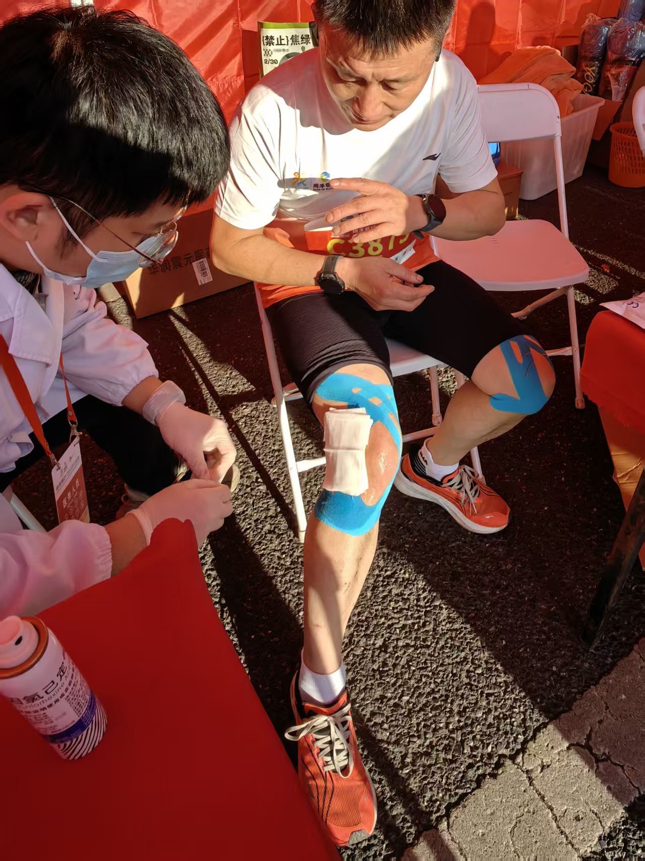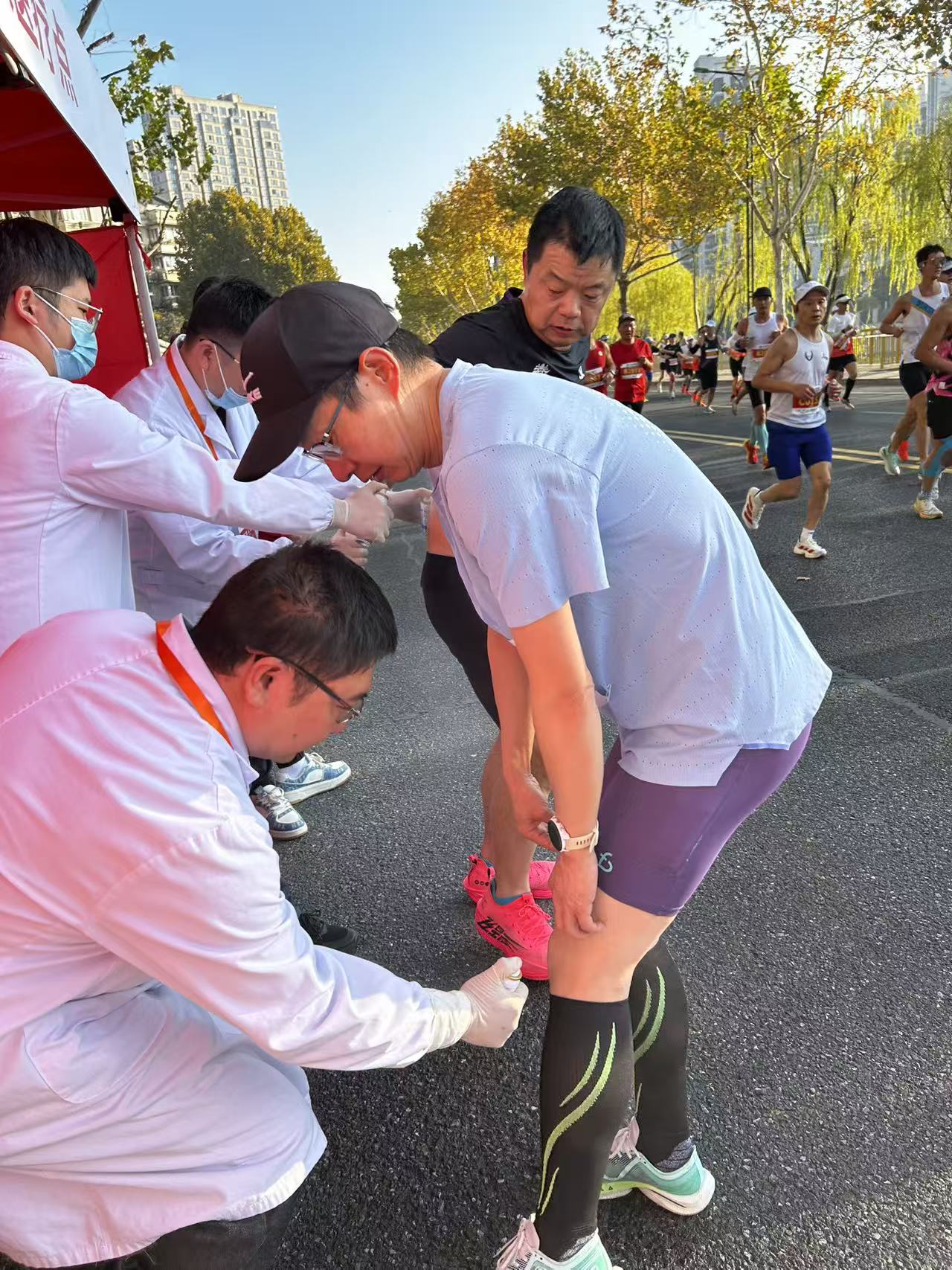 随着比赛的推进,选手们陆续经过医疗站点和救护车附近。医护人员们全神贯注,密切关注着每一位选手的状态。在固定医疗站点,医护人员们手持喷雾,为有需要的选手提供及时的喷雾保障服务。他们手法娴熟,动作迅速,短短时间内就为500余位选手进行了喷雾处理,有效缓解了选手们的肌肉疲劳和不适。