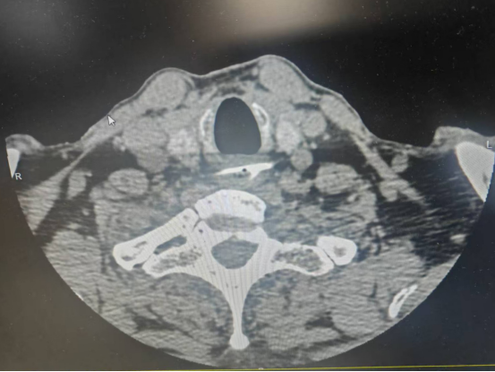 当晚18时许,急诊科传来急促的呼救。76岁的李爷爷(化名)晚餐时因食用甲鱼汤不慎吞下一块坚硬甲鱼骨,当即感到喉咙剧痛、吞咽困难,随即就出现呼吸急促、面色发绀的危急情况。家属连夜驱车将其送至我院急诊。耳鼻喉科接诊医生张嘉钰迅速评估病情,发现患者咽喉部剧烈疼痛、吞咽困难,并伴有轻度呼吸困难。为明确异物位置及风险,立即完善颈部CT及胸部CT检查,结果显示异物卡在咽喉深部,紧邻食道入口,存在刺穿食道或引发感染性休克的潜在风险。